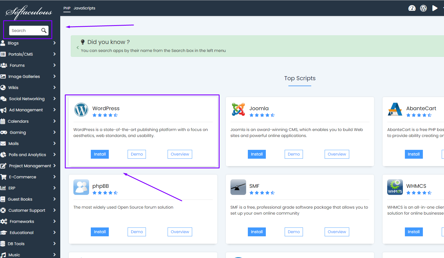 3. Cari WordPress, kemudian klik "install"