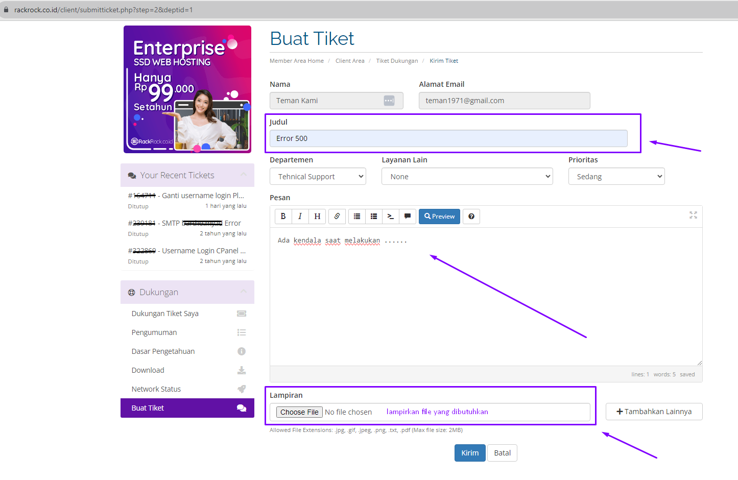 5. Jika sudah selesai silahkan bisa klik kirim kemudian tunggu balasan tiket dari tim kami.