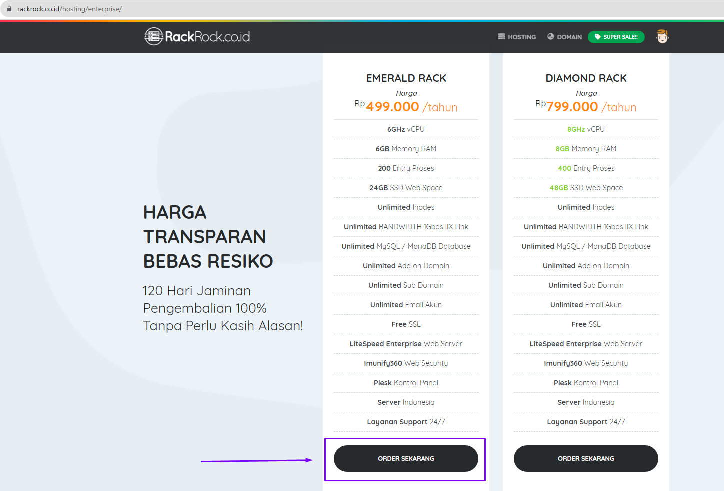 1. Silahkan masuk ke halaman hosting kami, misal pada halaman berikut https://rackrock.co.id/hosting/enterprise/