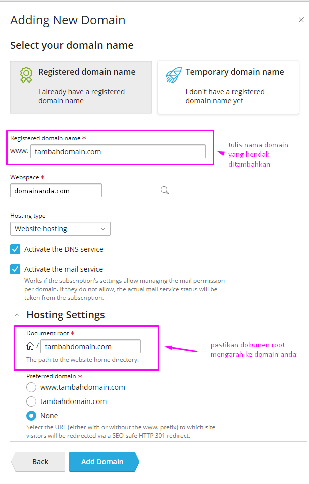 Catatan: Pastikan domain yang hendak dilakukan addon sudah mengarah ke server hosting agar proses addon bisa berjalan dengan lancar.