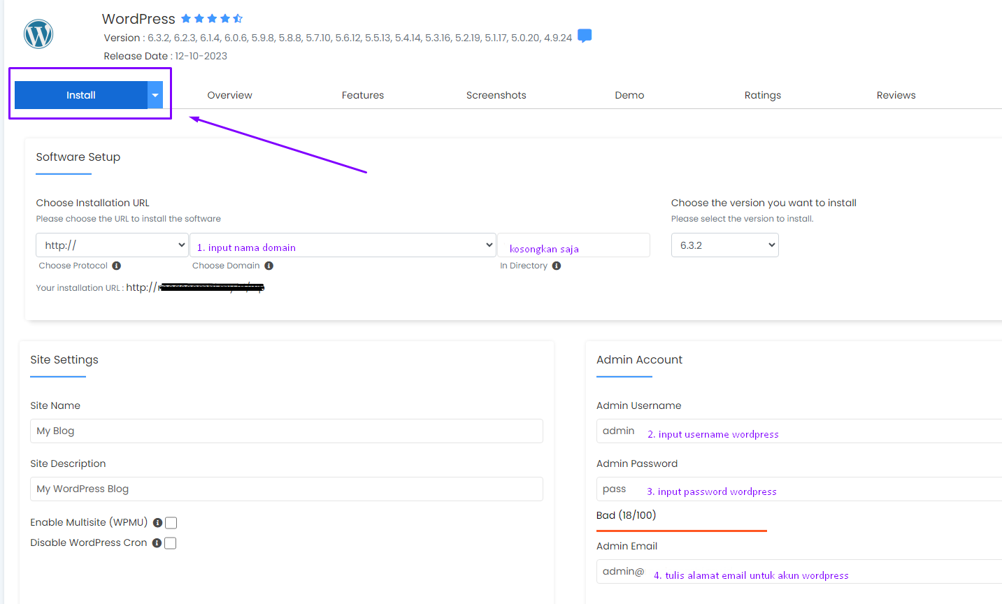Ada banyak cara menginstall cms ini, mulai dari manual atau instant dalam sekali klik. Beberapa hosting sudah menyediakan cms ini pada fitur softaculous, berikut langkah-langkahnya :