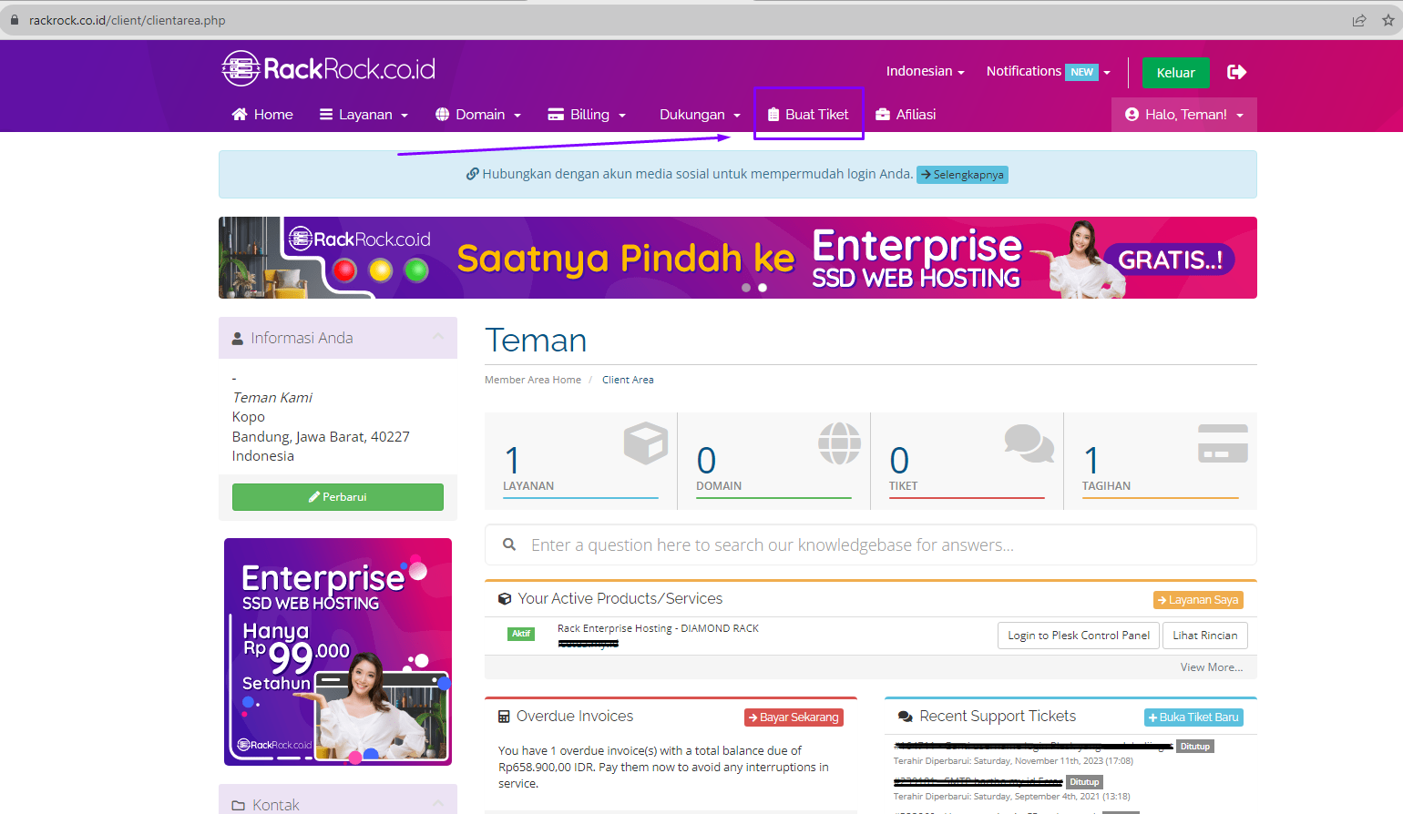 1. Login ke member area https://rackrock.co.id/client/index.php?rp=/login